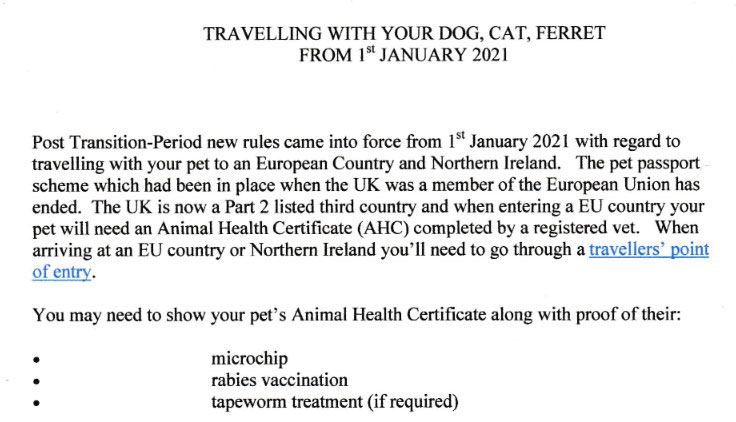 NB as at 1st January 2021 the requirements for returning your pets to the UK remain exactly the same as under the pet passport scheme. Allowing up to 5 days for the tape-worming treatment to take place before returning to the UK.