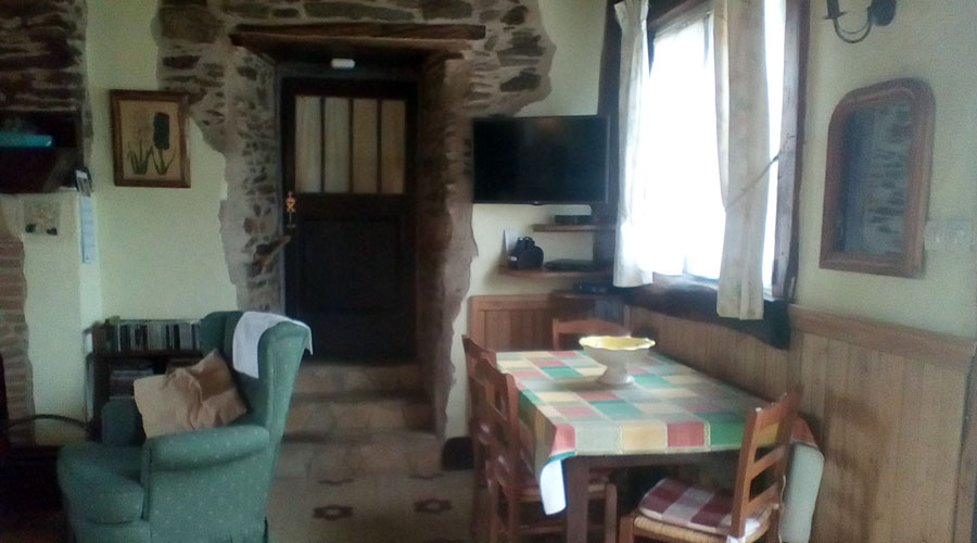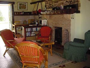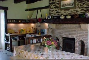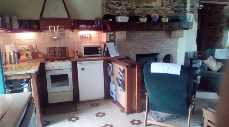 Traditional French style kitchen for cooking /eating and convivial conversation. Fully equipped with dish washer, under-counter fridge (additional fridge space and freezer in garage), gas cooker, microwave, extractor fan and concealed lighting above work surface. A dining table with seating for up to 6 people, and easy chairs. Original stone fireplace, oak beams, farm -house doors, picture lights, ceiling fan and a log fire. Tiled floor.